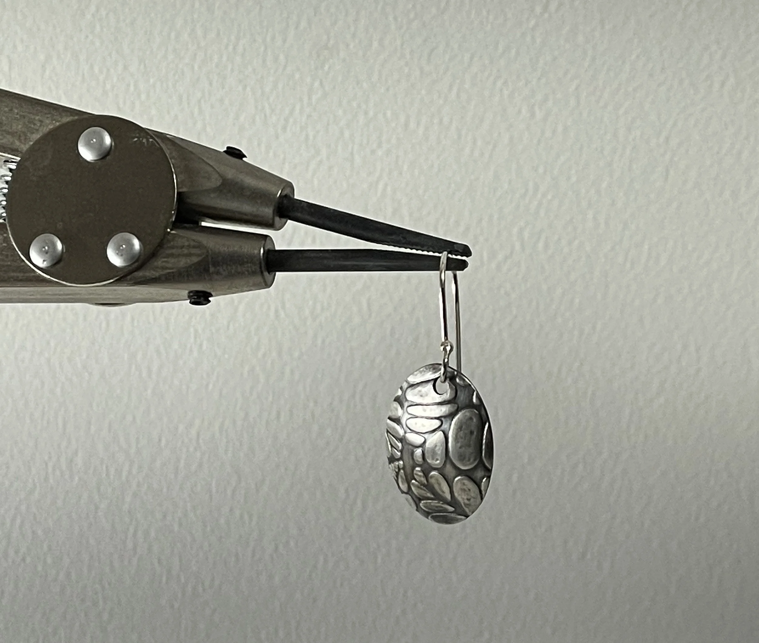 These earrings measure 25 mm long and 18 mm wide (approximately 1 in long and 3/4 in wide). Each earring was cut, textured and domed by hand. With hand-made sterling silver ear wires. These were lightly oxidized to bring out the texture pattern.
